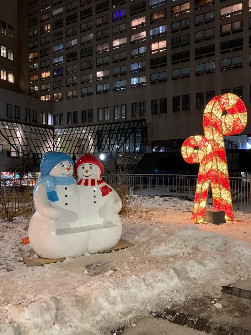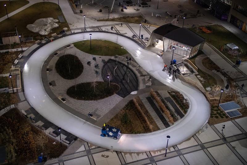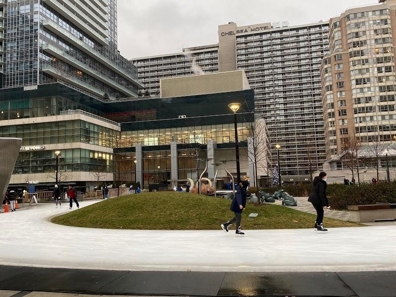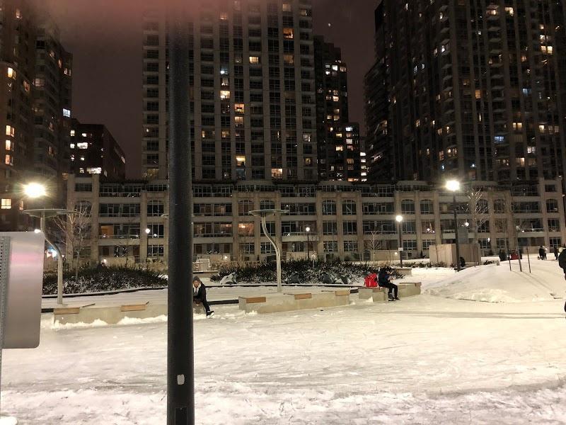 Lovely little ice skating trail right at College Park. Visited afternoon and there was lots of seating space available. No reservations needed. Public washrooms available. CORRECTION: Reservations *are* needed via efun.toronto.ca. However there is no line for drop ins, especially during weekdays.