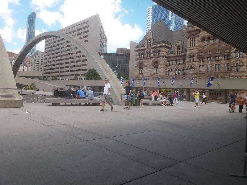 Very Busy Intersection with major Heritage Buildings. The Hudson Bay, Toronto Old City Hall, New City Hall, Eaton Centre.