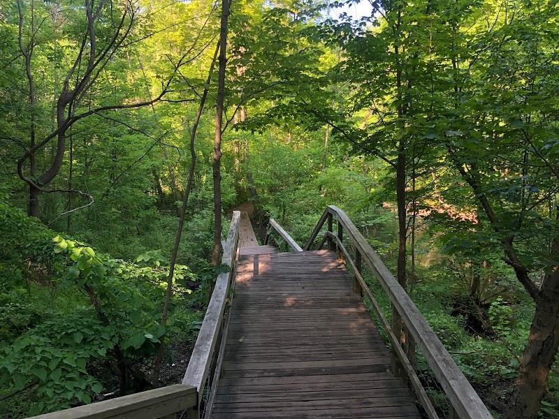 Amazing location and park to hike and enjoy a nice sunny day. Almost in our backyard and I never knew it was even in the city unit I started researching Google Maps. Parking right off Sherwood Avenue and free. The park starts with a great snow hill for the kids to play on. Then it goes down into a gorge with hills on both sides that does keep you warmer on a sunny day, no winds. Trail maps at the top of the hill, parking lot entrance and down at the bottom. The entrance has tables to sit and relax or some lunch. The tails go off in a few directions but you can choose to go clockwise or counter clockwise and still come back to the beginning. Some stairs on the trails and some wooden structures to cross. Perfect for all family members even you're doggies. The trails are all fenced off on both sides and I assume to keep the wooded areas from getting destroyed. But even though everything is fenced in, still very nice, very quiet and you forget this is still in the city. Many people hiking were wearing Ice cleats and maybe a great idea as I was slipping and sliding a few times with snow covering ice areas.