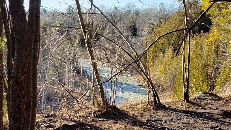 There's a parking lot here. Usually busy on the weekends and holidays so people tend to park on the roadside instead just be aware that parking enforcement does come around from time to time here and hand out tickets. There's a few trails that runs through this spot that follows the rouge river and some high hills and you can actually access both side of the river given you cross the bridge first.